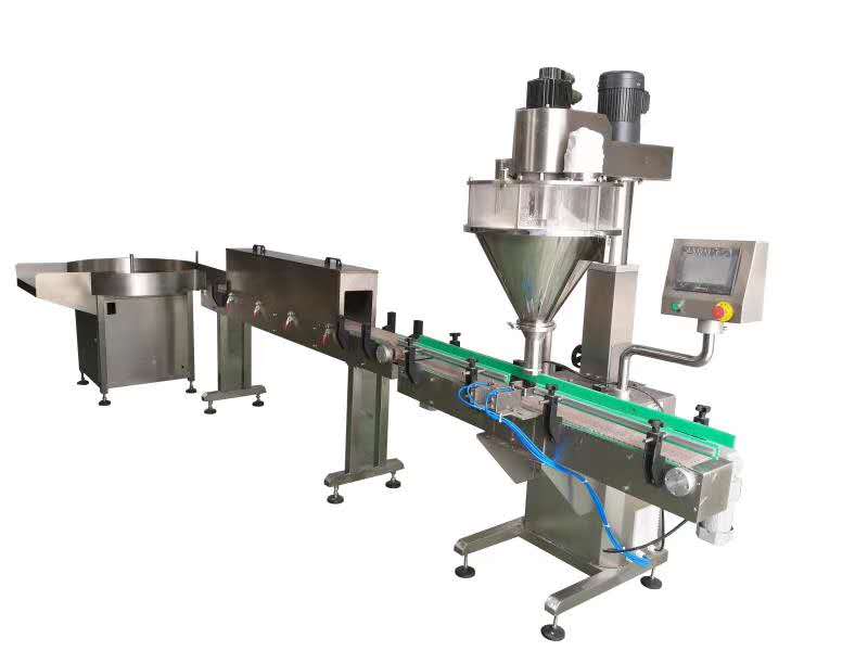 1.全自動粉末瓶裝灌裝生產(chǎn)線:理瓶機(jī) →自動上料機(jī) →單頭粉末灌裝機(jī) →旋蓋機(jī)(或封罐機(jī))→瓶口鋁箔封口機(jī) →貼標(biāo)機(jī) →噴碼機(jī) →鏈板輸送帶 →裝箱平臺,可以根據(jù)產(chǎn)品的要求選擇流水線配置
